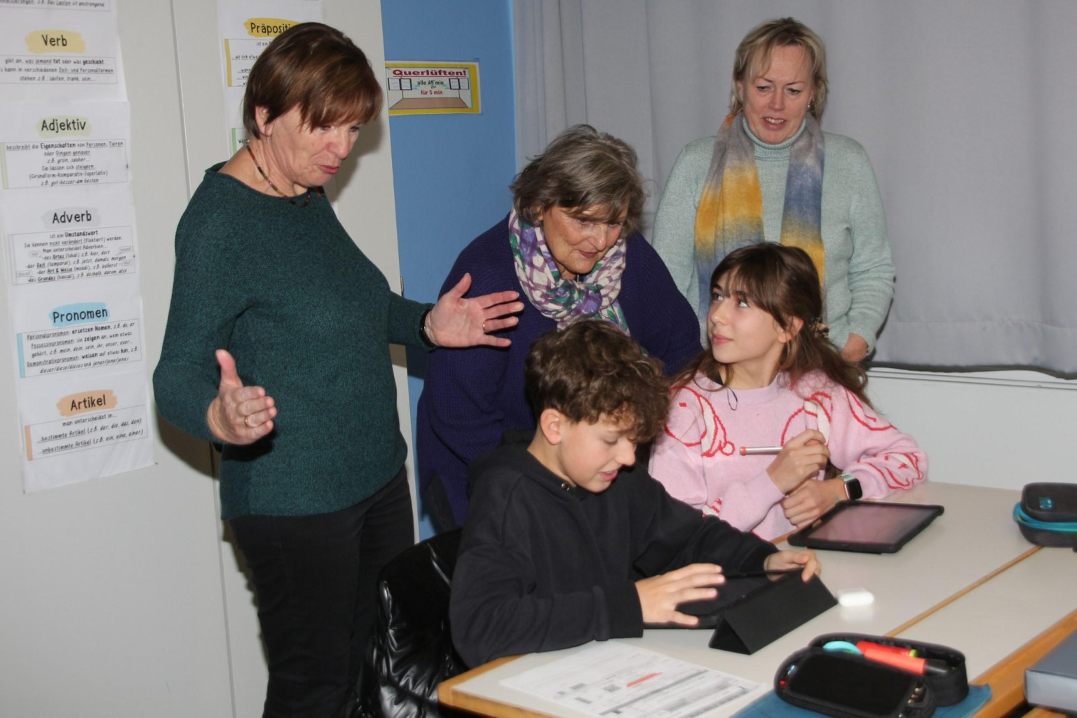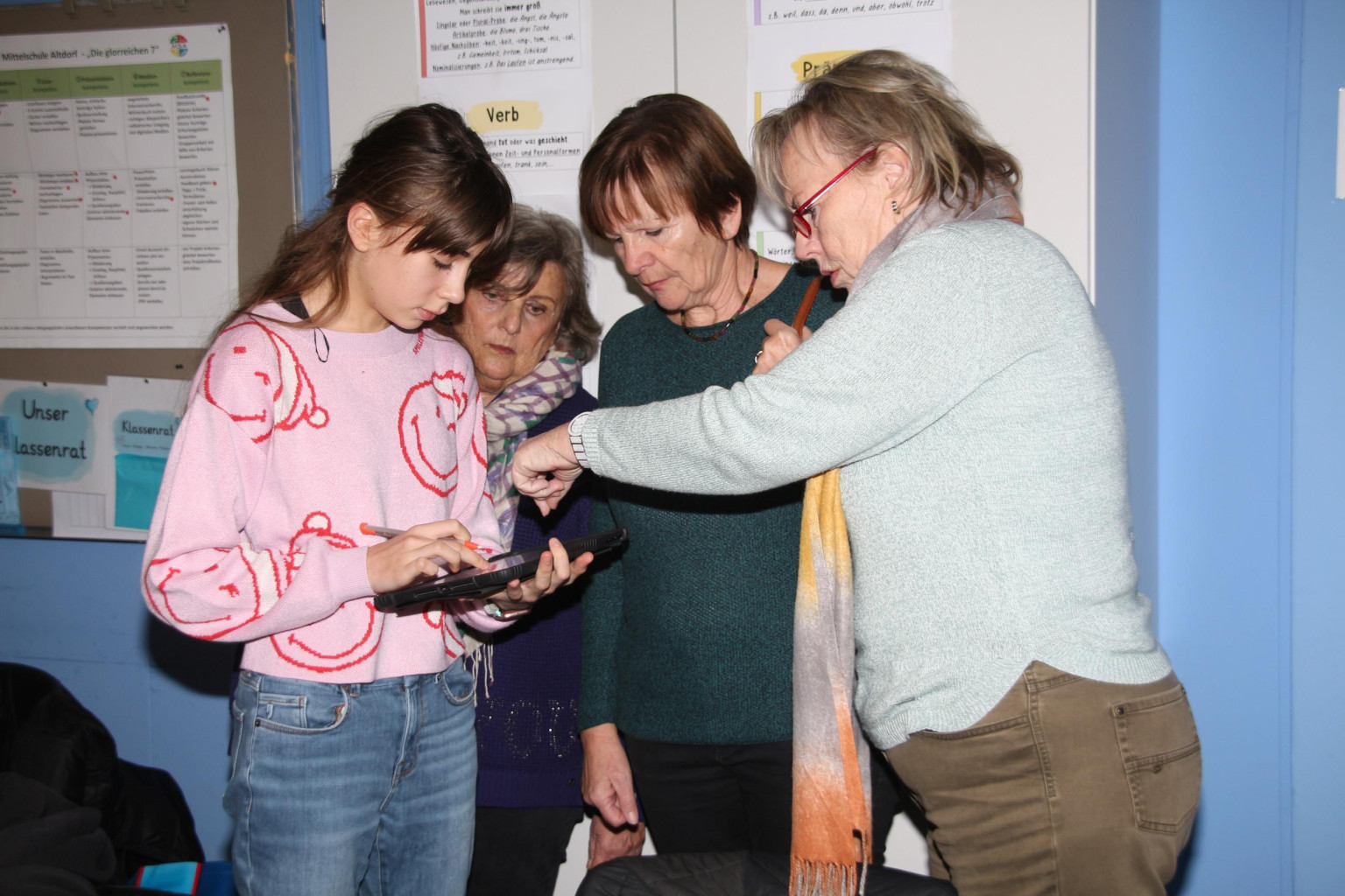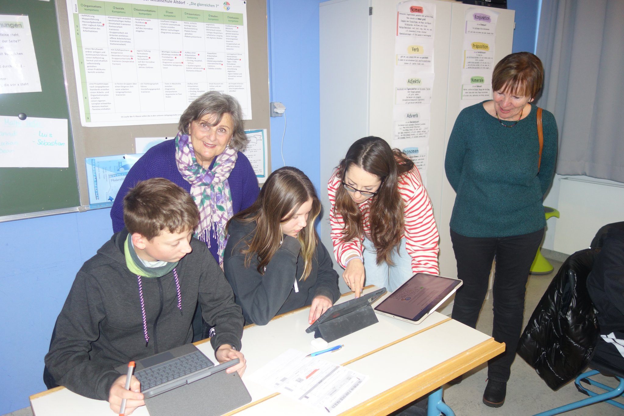 Ursula Eggert, für die Schülertafel zuständiges Vorstandsmitglied der Tafel Nürnberger Land e.V. zeigte sich sehr beeindruckt vom großen Engagement der Lehrkräfte in der Mittelschule, da die Einführung und die Umsetzung der Arbeit mit den digitalen Werkzeugen viel Zeit, Kraft und Energie erfordere. Auch sei bemerkenswert, mit welchem Engagement und hervorragender Motivation die Schülerinnen und Schüler in der Klasse arbeiteten. Auch Frau Sponsel, Vorstandsmitglied der Kurlbaum-Stiftung, war sehr angetan von den neuen Unterrichtsformen in der Klasse, die mit den iPads hervorragend umgesetzt würden. Beide waren sich einig, dass die Mittelschule - vor allem deren Schülerinnen und Schüler - viel zu oft unterschätzt würden. Sie seien es wert, auch zukünftig intensiv unterstützt zu werden. Die Arbeit in dieser Klasse sei ein hervorragendes Beispiel für eine gelungene Umsetzung der digitalen Wende.